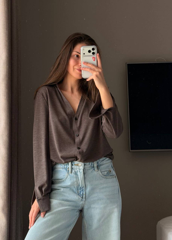 Интересный коричневый цвет, подходит ко всему в моем гардеробе за счет легкого эффекта меланжа. Ткань очень приятная, нежная, легко заправляется в пояс брюк и юбок. У меня высокий рост и мне обычно рубашки бывают коротки, тут же все с запасом, и длина рукава, и длина самой рубашки.